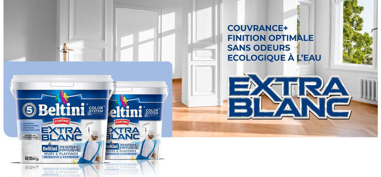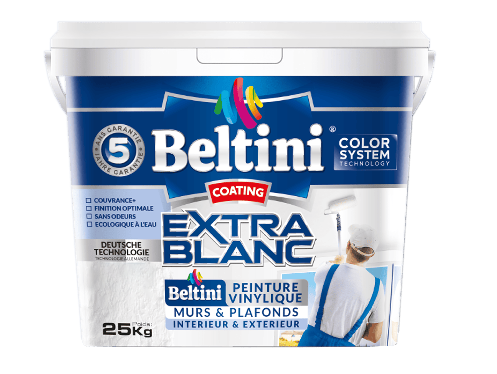 Nature du produit: Peinture à base de copolymère acrylique. Utilisation: Peinture de bâtiment, pour intérieur et extérieur, s’applique sur supports neufs et anciens. Propriétés: Séchage rapide. Haut pouvoir couvrant. Facilement applicable, ne laisse pas de trace. Peut être teinté par nos teintes BELTINI. Condition de stockage:. Stocker dans son emballage d’origine à l’abri du gel et des fortes chaleurs. Mode d’emploi: Bien mélanger avant l’application. Produit prêt à l’emploi, en cas de dilution ne pas dépasser 5%. Dilution à l’eau. Matériel d’application: brosse, rouleau.•Rendement: 6 m2/kg ±0.5. Temps de séchage: 4 à 6H